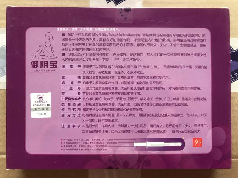 適用范圍:女性生殖系統(tǒng)黏膜感染,特別是針對耐藥菌支原體、衣原體、霉菌等病原體;保質(zhì)期:24個月;抑菌類別:支原體、衣原體、霉菌、白色念珠菌、金黃色葡萄球菌、大腸桿菌等;注冊商標證號:10918451;執(zhí)行標準:Q/WHZZM001;生產(chǎn)許可證號:鄂衛(wèi)消證字(2017)第0021號。產(chǎn)品會根據(jù)市場變化,會隨時對產(chǎn)品包裝進行稍加改動,購買請認準“御陰寶”商標即可。認準淘寶店鋪:https://item.taobao.com/item.htm?spm=a1z10.1-c.w4004-1344584184.4.481b5929Jg4obC&id=573758099973